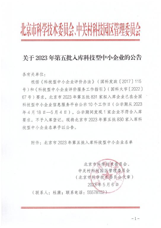 北京市2023年第5批入庫科技型中小企業名單公告正文.jpg PICTURE