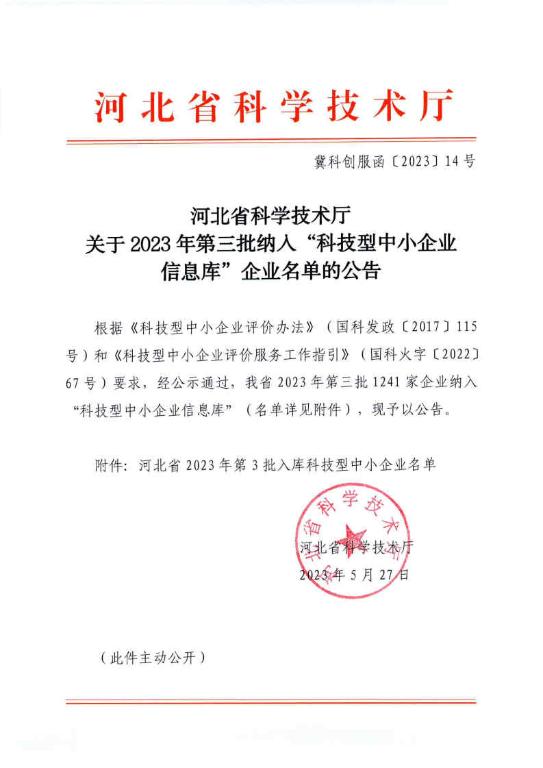 河北省2023年第3批入庫(kù)科技型中小企業(yè)名單公告正文.jpg PICTURE