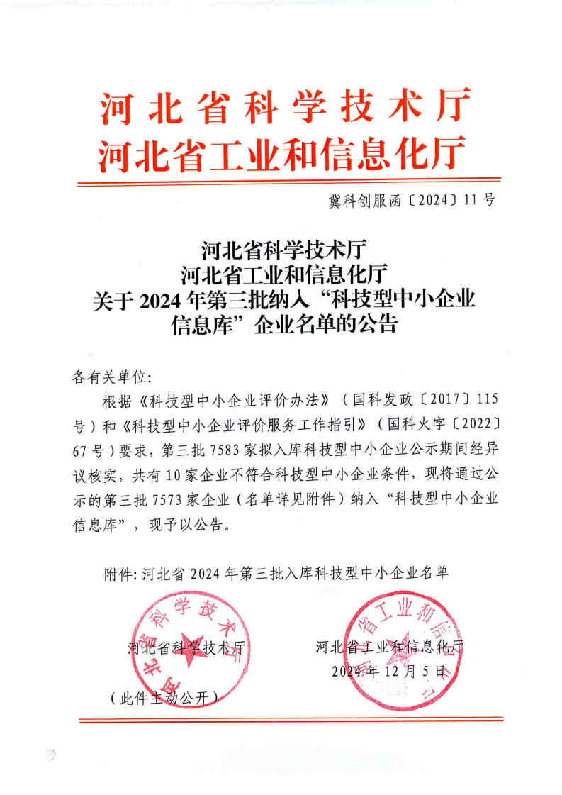 河北省2024年第3批入庫科技型中小企業名單公告正文.jpg PICTURE