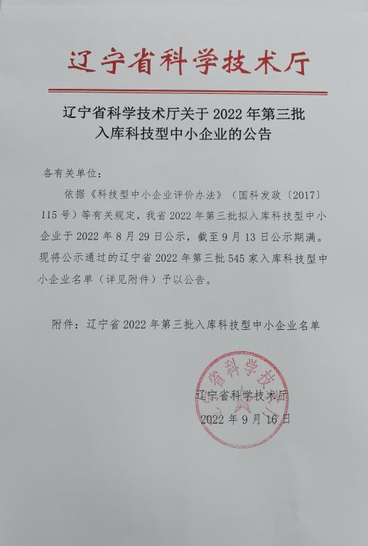 遼寧省2022年第3批入庫科技型中小企業(yè)名單公告