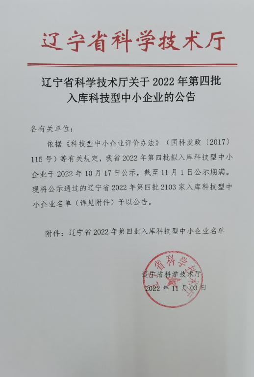 遼寧省2022年第4批入庫科技型中小企業名單公告正文.jpg PICTURE