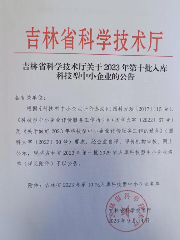 吉林省2023年第10批入庫科技型中小企業名單公告正文.jpg PICTURE