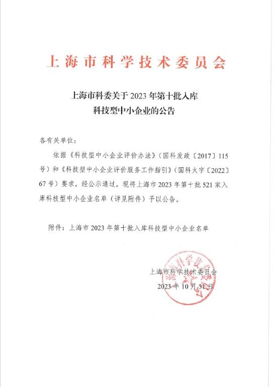 上海市2023年第10批入庫科技型中小企業名單公告正文.jpg PICTURE