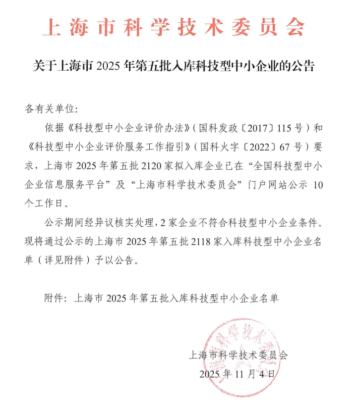 上海市2025年第5批入庫科技型中小企業(yè)名單公告