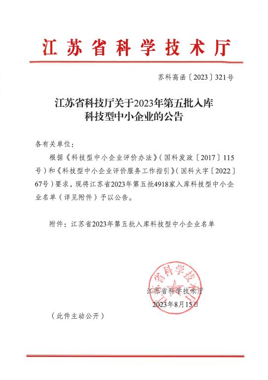 江蘇省2023年第5批入庫(kù)科技型中小企業(yè)名單公告正文.jpg PICTURE
