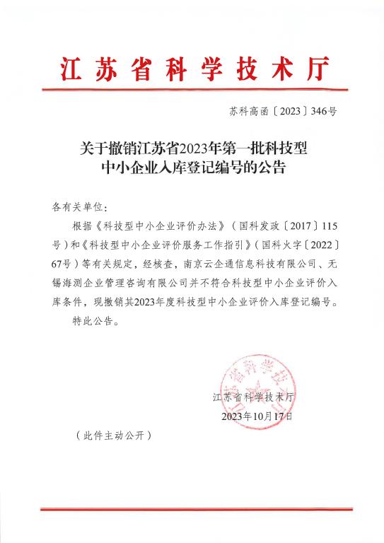 關于撤銷江蘇省2023年第一批科技型中小企業入庫登記編號的公告_00.jpg PICTURE