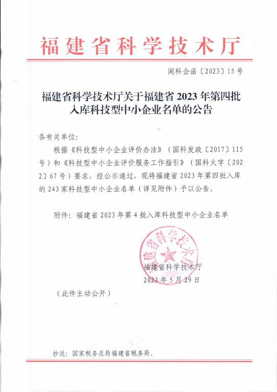 福建省2023年第4批入庫科技型中小企業名單公告正文.jpg PICTURE
