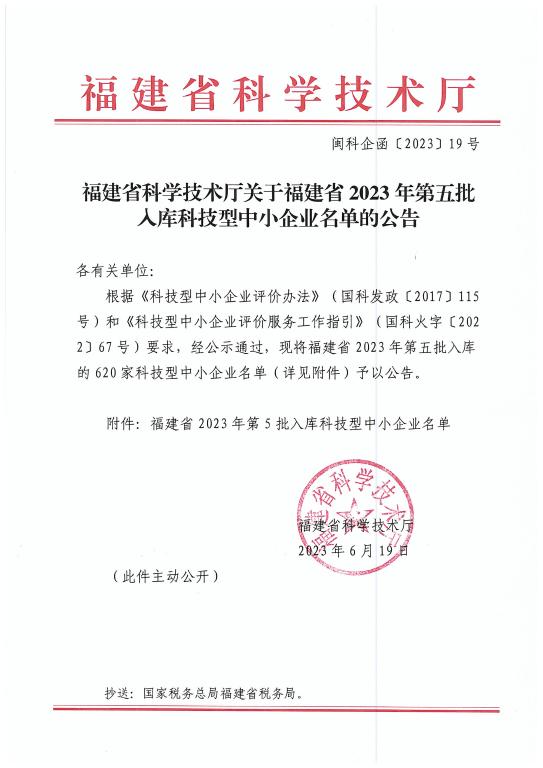 福建省2023年第5批入庫科技型中小企業(yè)名單公告