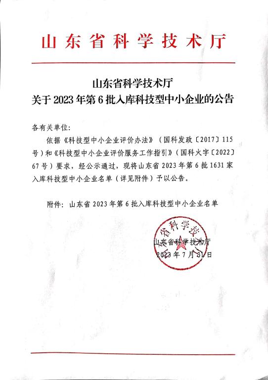 山東省2023年第6批入庫科技型中小企業名單公告正文.jpg PICTURE