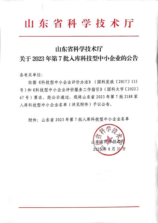 山東省2023年第7批入庫科技型中小企業名單公告正文.jpg PICTURE