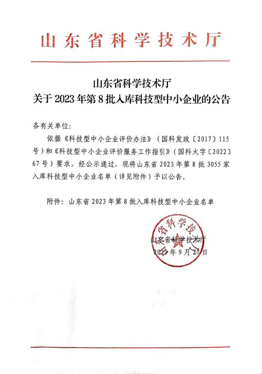 山東省2023年第8批入庫科技型中小企業名單公告正文.jpg PICTURE