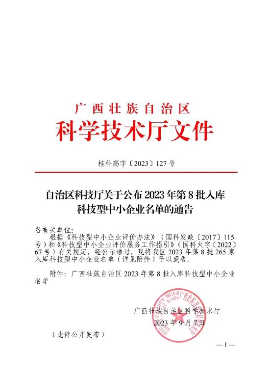 廣西壯族自治區2023年第8批入庫科技型中小企業名單公告正文.jpg PICTURE
