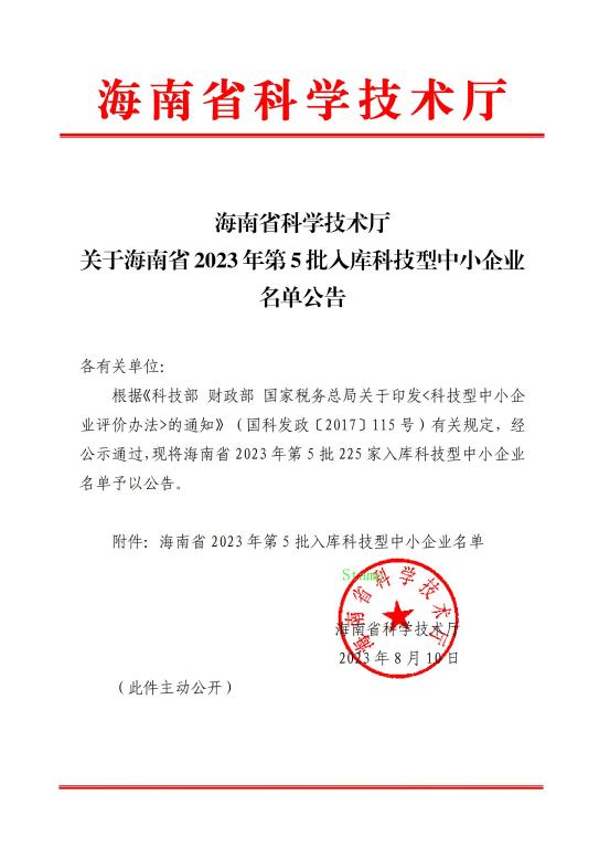 海南省2023年第5批入庫科技型中小企業名單公告正文.jpg PICTURE