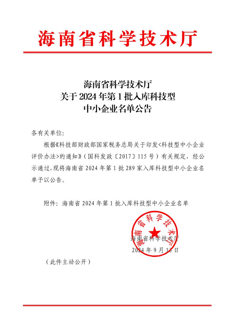 海南省2024年第1批入庫科技型中小企業名單公告正文.jpg PICTURE