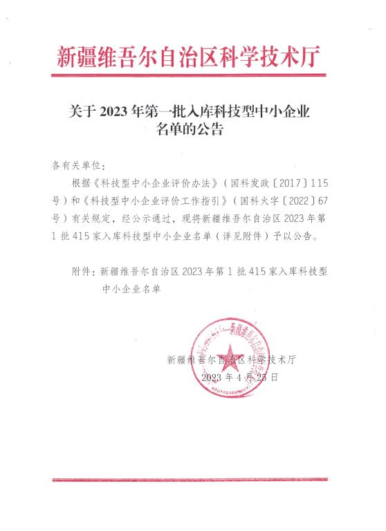 新疆維吾爾自治區(qū)2023年第1批入庫(kù)科技型中小企業(yè)名單公告正文.jpg PICTURE