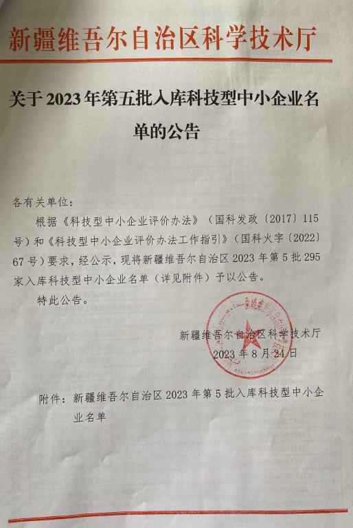 新疆維吾爾自治區2023年第5批入庫科技型中小企業名單公告正文.jpg PICTURE