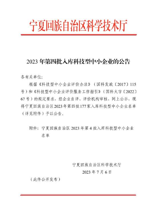 寧夏回族自治區(qū)2023年第4批入庫科技型中小企業(yè)名單公告