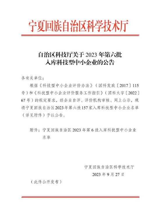 寧夏回族自治區2023年第6批入庫科技型中小企業名單公告正文.jpg PICTURE