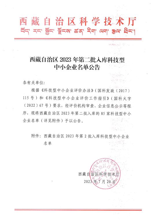 西藏自治區(qū)2023年第2批入庫(kù)科技型中小企業(yè)名單公告正文.jpg PICTURE