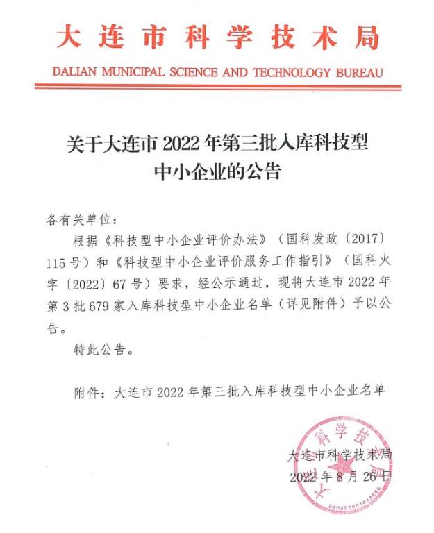 大連市2022年第3批入庫科技型中小企業(yè)名單公告