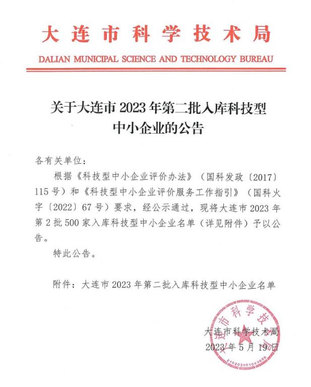 大連市2023年第2批入庫科技型中小企業名單公告正文.jpg PICTURE