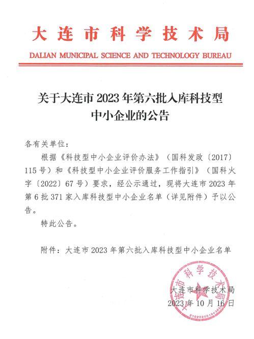 大連市2023年第6批入庫科技型中小企業名單公告正文.jpg PICTURE